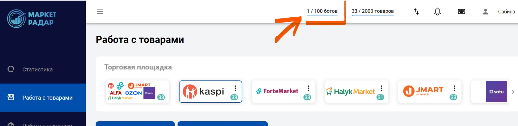В верхней панели управления Маркетрадаром вы можете увидеть значок бота и их кол-во, которое имеется у вас в аккаунте.