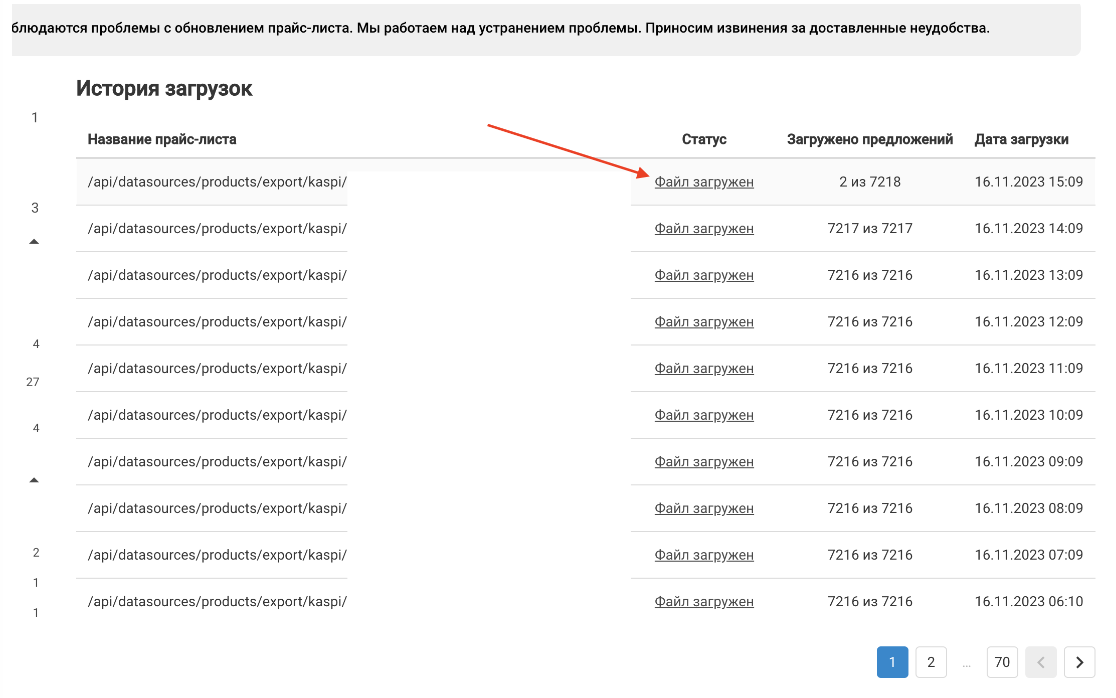 Если вдруг такое происходит, или же вы видите в истории загрузок прайс листа каспи очень старую дату, например видно что последний раз каспи забирал данные несколько часов назад