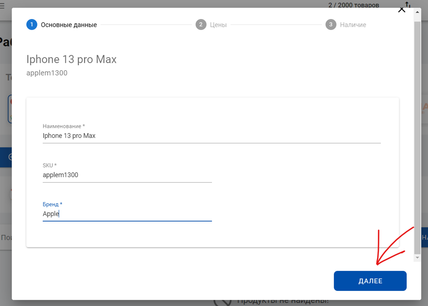 Переходим в интерфейс создания товаров и создаем товар: Первый этап создания товара - основные данные: наименование, SKU(артикул) и бренд. На примере будет телефон Apple