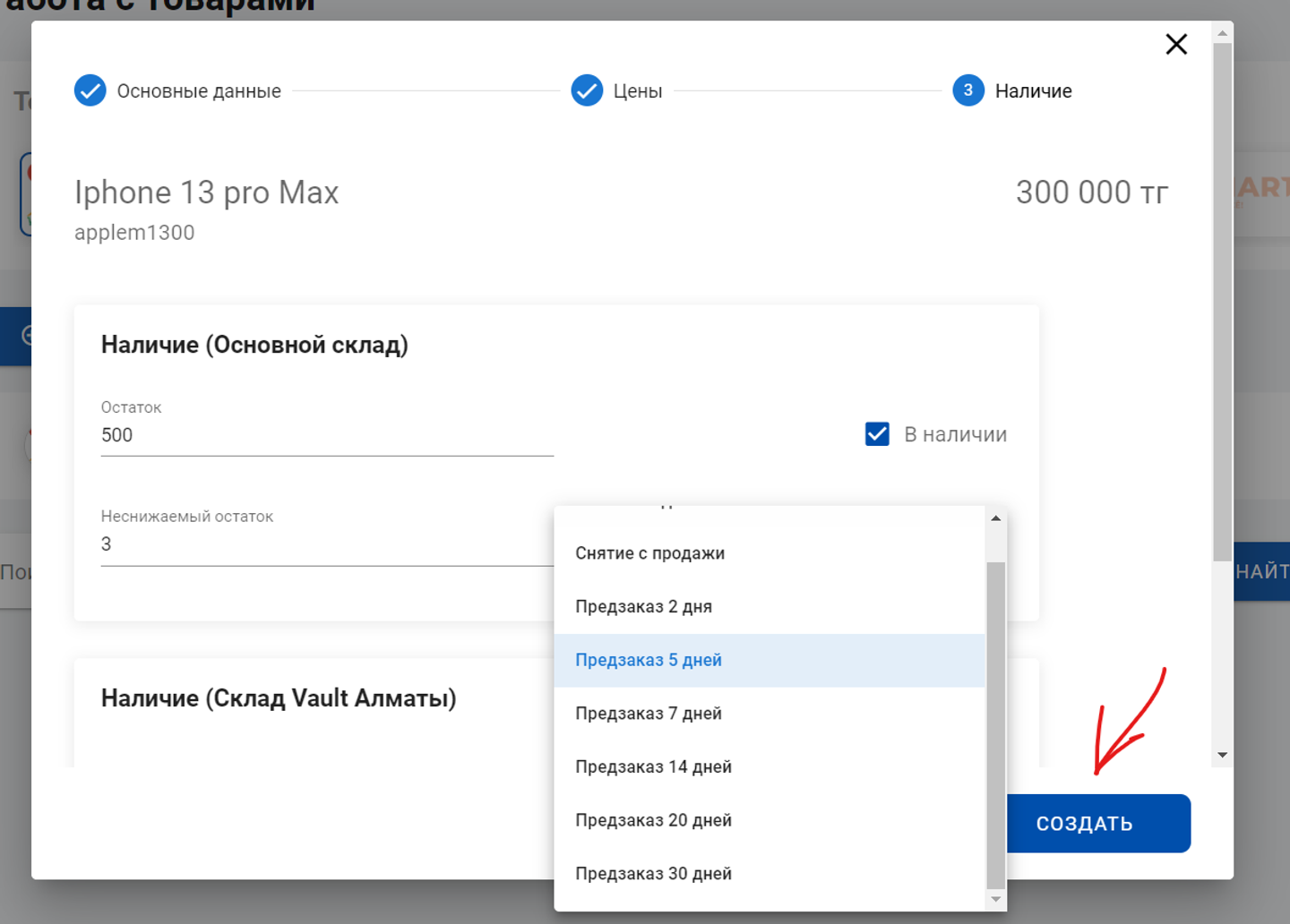 3 Шаг —выставляем наличие товара на складах.