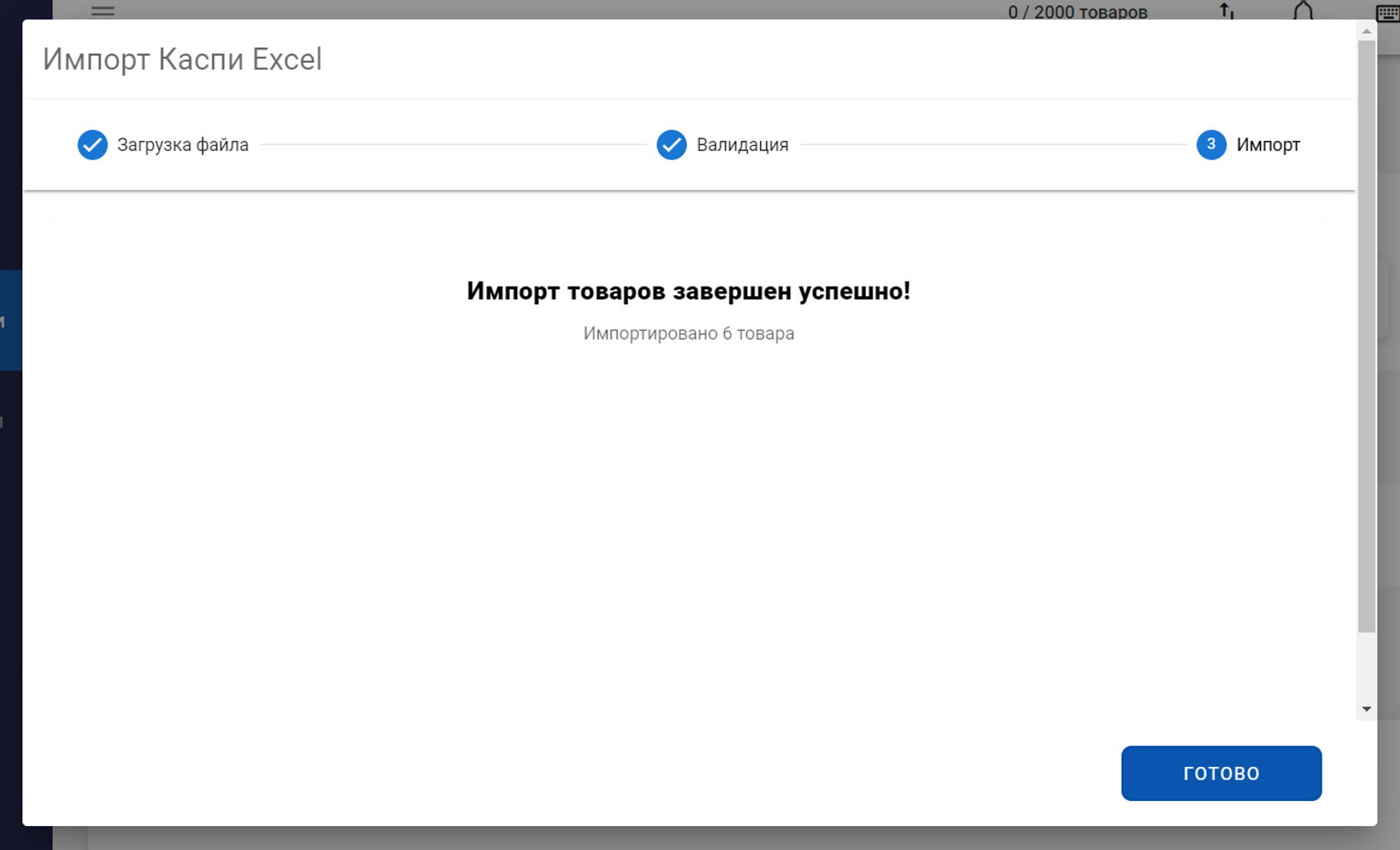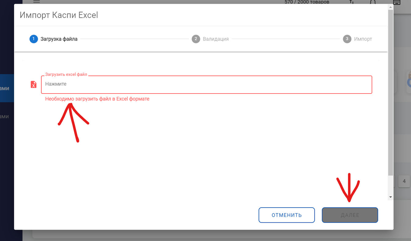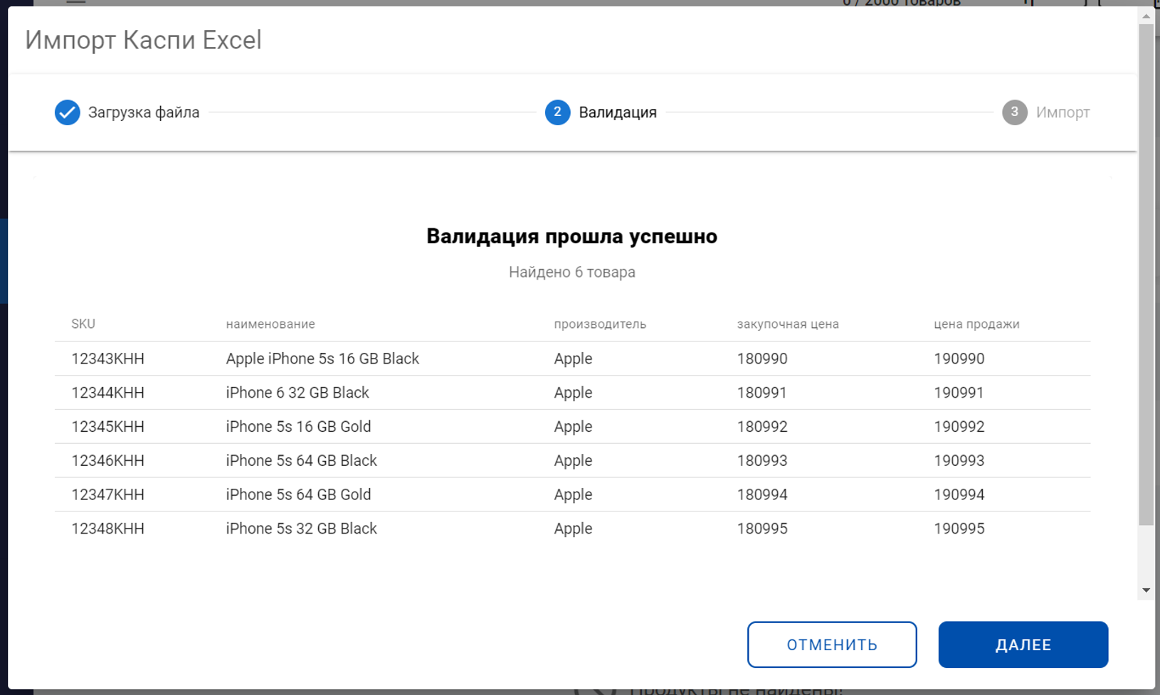 После того, как вы загрузили файл, товары должны пройти валидацию. После валидации нажмите “Далее”
