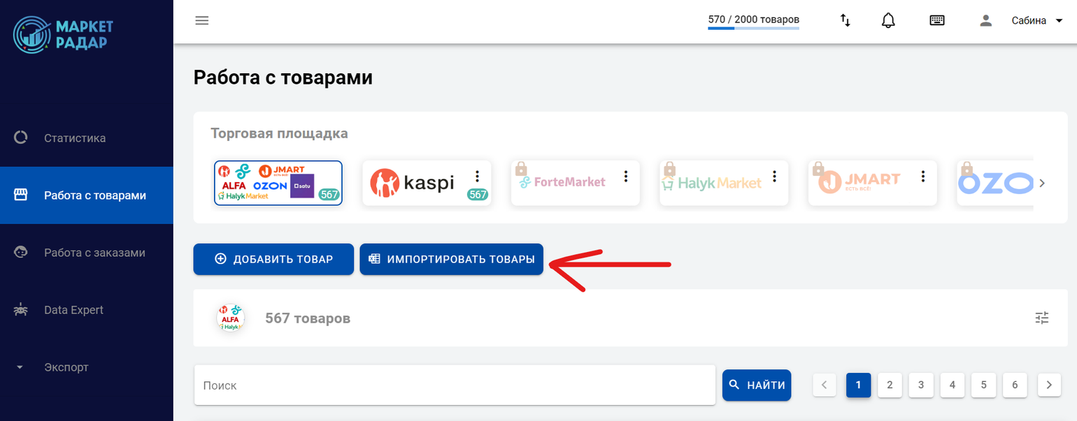 В кабинете МаркетРадар нажмите на кнопку Импортировать товары