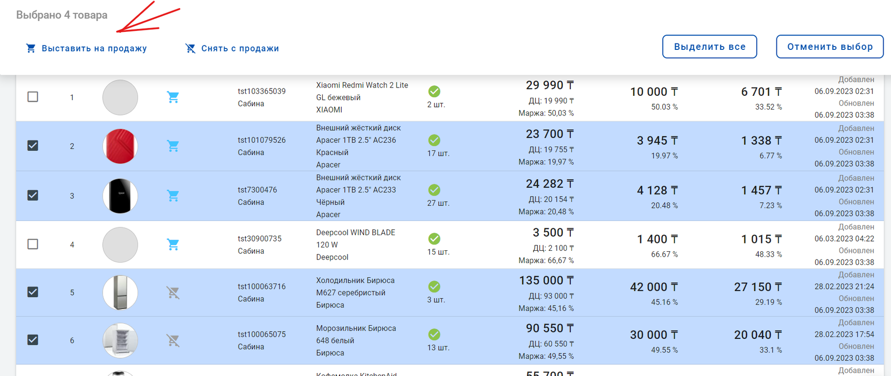 Вы попали в каталог товаров поставщика. Выберите нужные товары у поставщика, отметьте их и в верхней панели нажмите Выставить на продажу