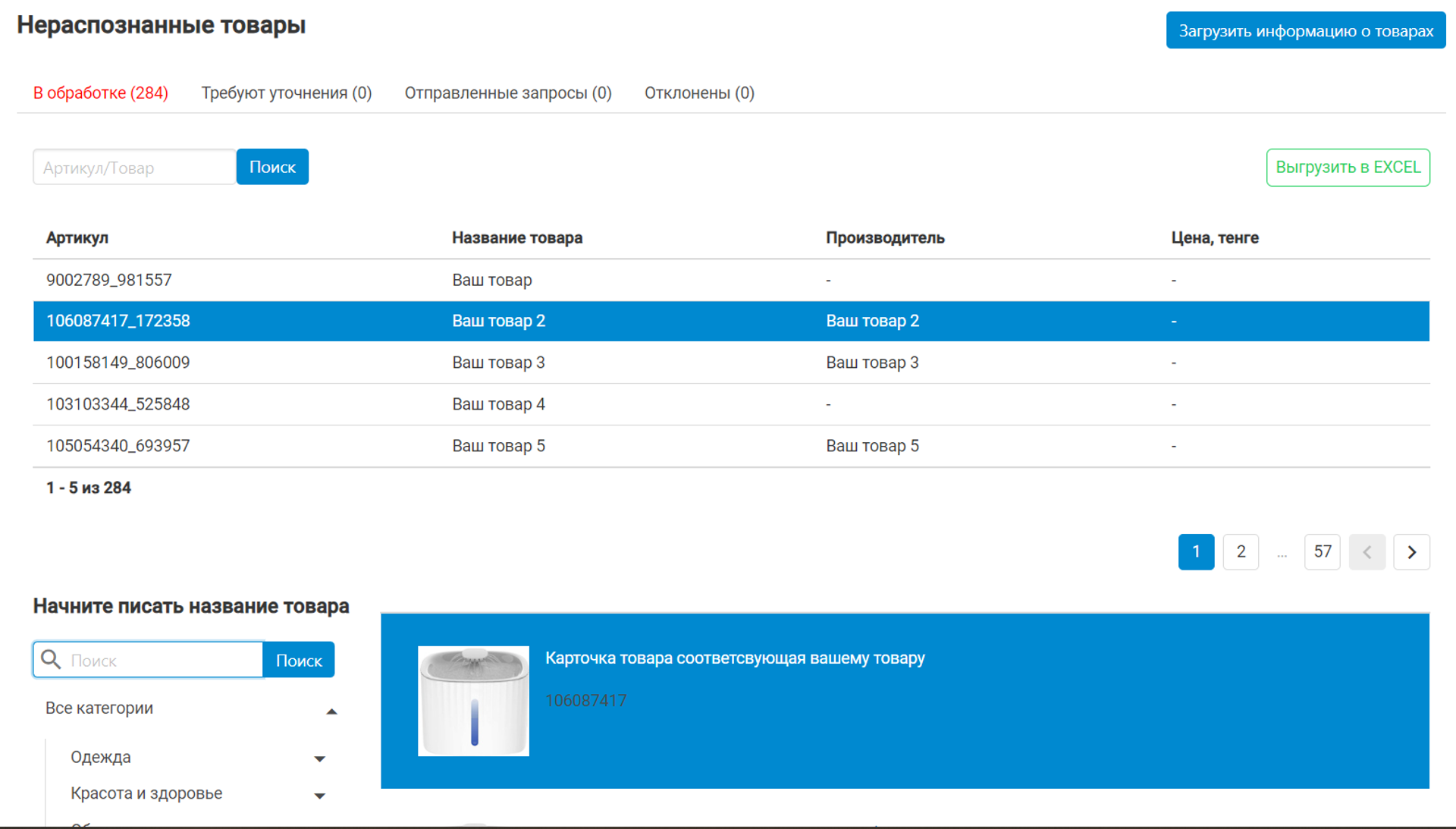 Добавленные товары поставщика теперь уходят в прайс листы на все ваши подключенные маркетплейсы. Например в Каспи эти товары через час можно найти в разделе Нераспознанные