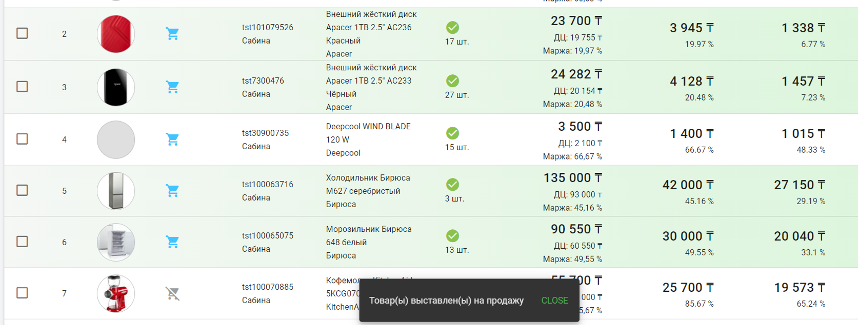 Поздравляем! Вы добавили товары от поставщика себе в магазин. В подтверждение этому выбранные товары подстветятся зеленым и появится уведобление, как на скриншоте.