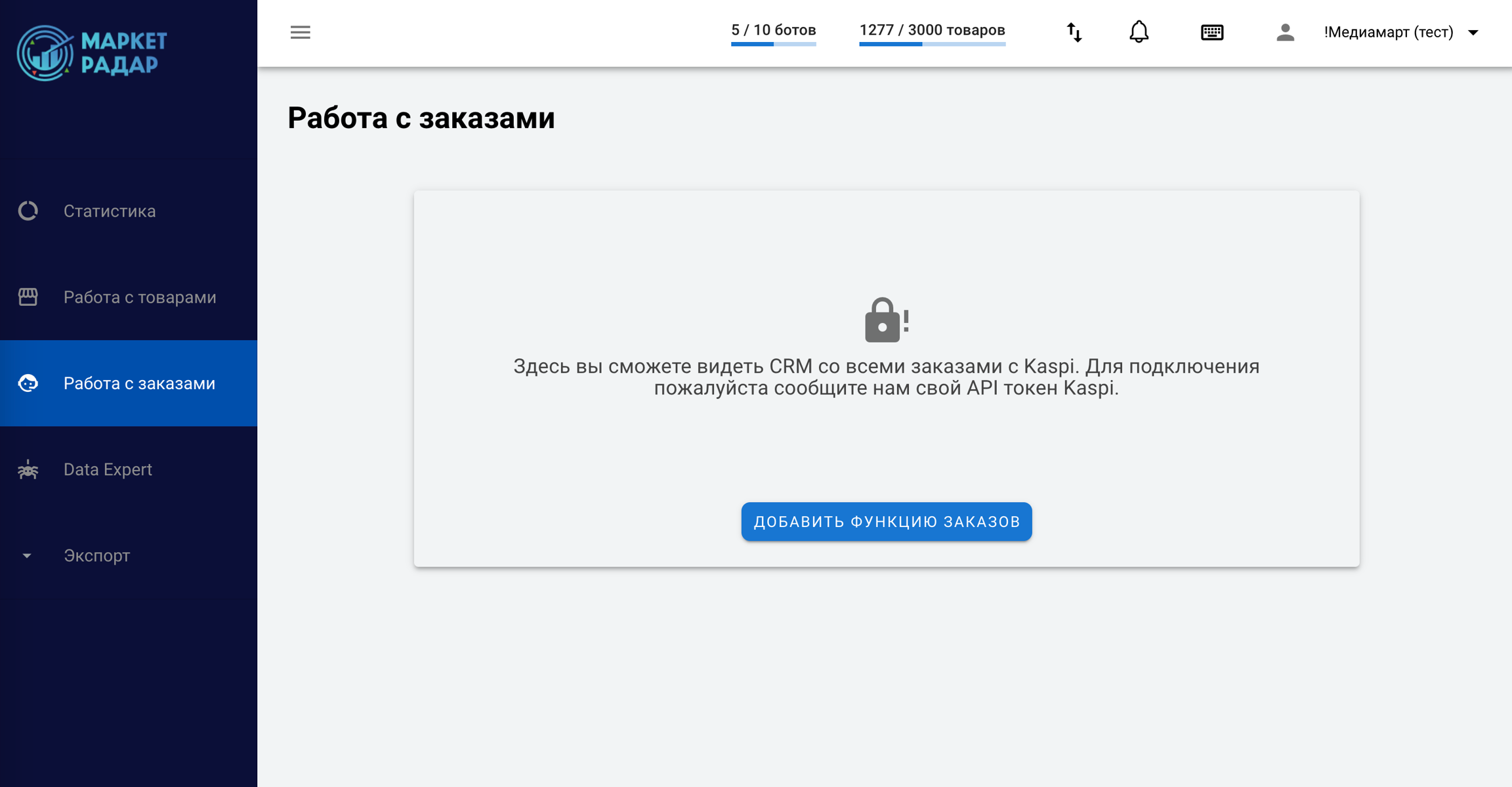 Нажмите добавить функцию заказов и введите ваш Kaspi токен, который вы можете найти в личном кабинете каспи