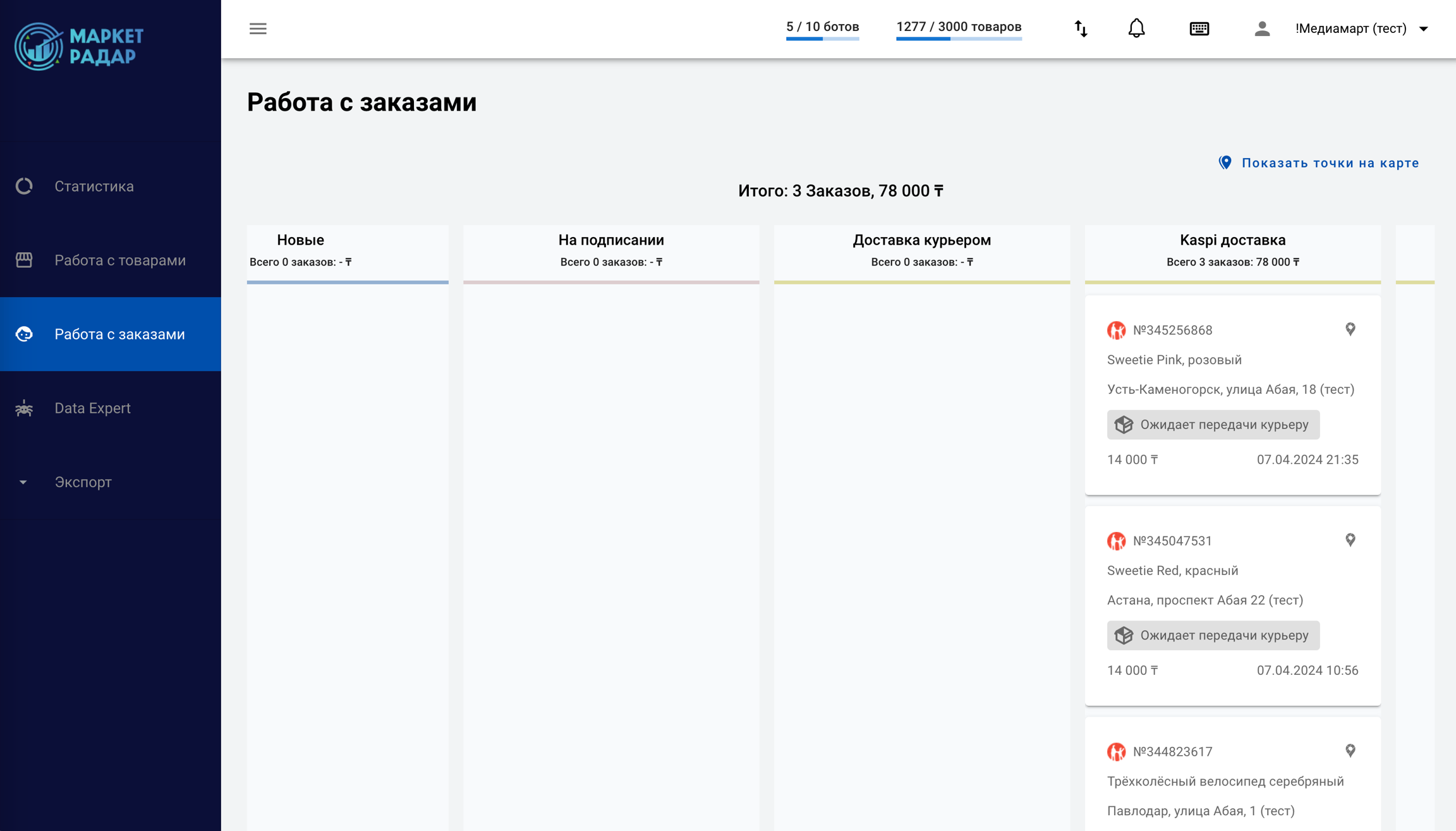 Marketradar позволяет управлять всеми вашими заказами с разных маркетплейсов с единого экрана. На данный момент поддерживается импорт заказов с двух площадок: Kaspi и OZON