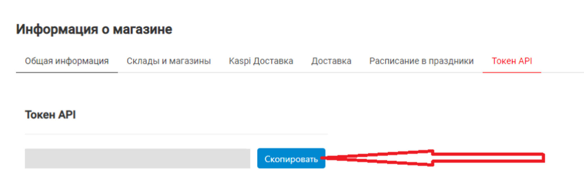 Kaspi API ключ можно найти в личном кабинете в разделе Токен API. Его нужно сгенерировать или скопировать если он уже был сгенерирован ранее.