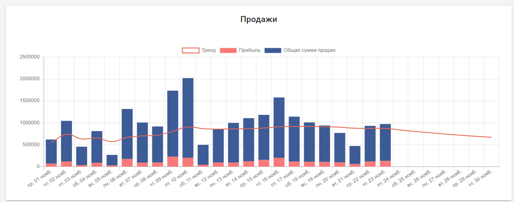 💡 В данном графике, как вы можете заметить показываются 3 показателя: Синее - общая сумма продаж. Красное - прибыль. Здесь вы можете увидеть чистую прибыль своих продаж. Полоска тренда показывает как обстоит ситуация с продажами в целом: подъем или продажи падают.